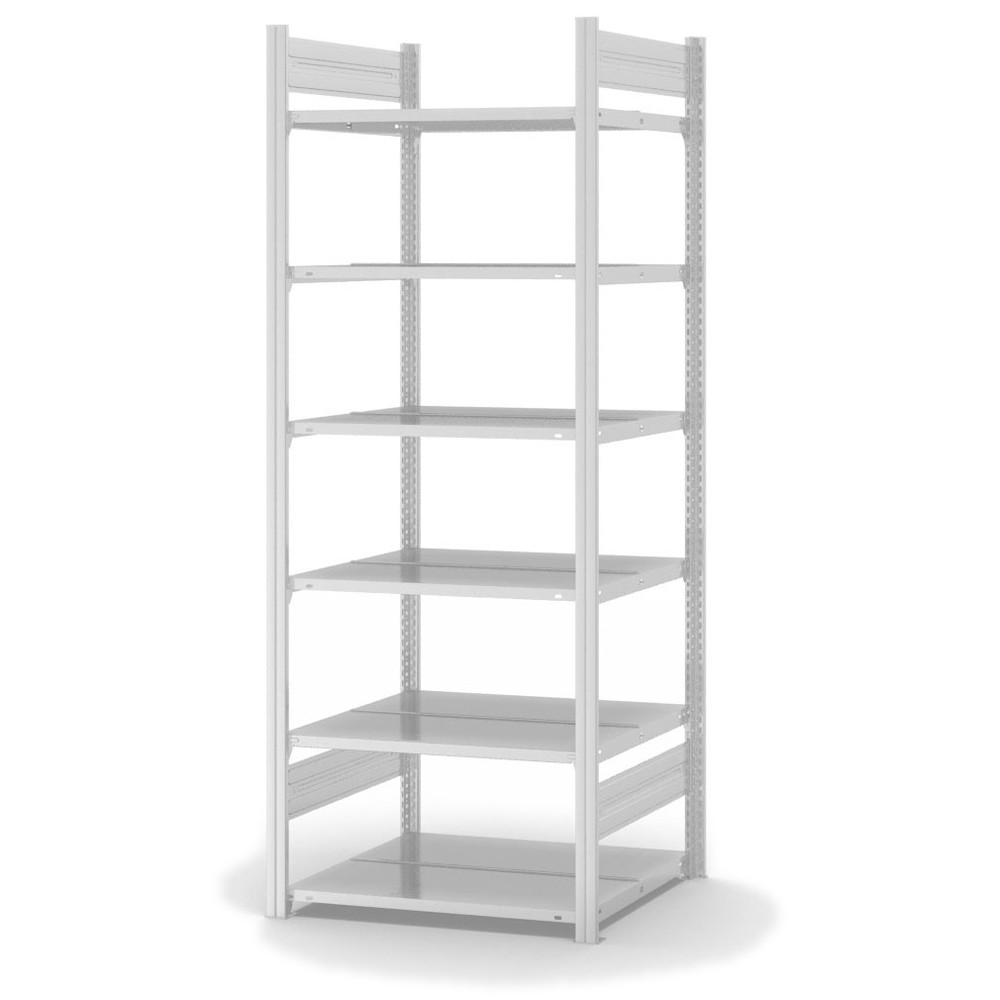 Aktenregal Anbauregal Stecksystem Höhe: 2000 mm Breite: 750 (760) mm Tiefe: 600 (635) mm Oberflächen Ebenen: RAL 7035 Oberflächen Stützen: RAL 7035 Anzahl der Fachebenen: 6 Stück Fachlast: 90 kg :: Feldlast: 650 kg Bedienung: Zweiseitig Zusatzinfo: Für 108 Ordner
