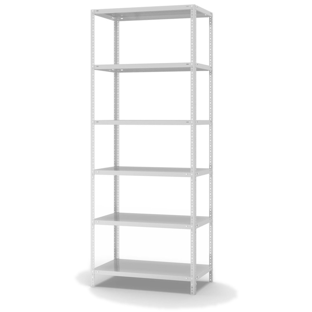 Lagerregal Anbauregal Schraubsystem Höhe: 2500 mm Breite: 1000 mm Tiefe: 500 mm Oberflächen Ebenen: RAL 7035 lichtgrau Oberflächen Stützen: RAL 7035 lichtgrau Anzahl der Fachebenen: 6 Stück Fachlast: 150 kg :: Feldlast: 625 kg Bedienung: Zweiseitig