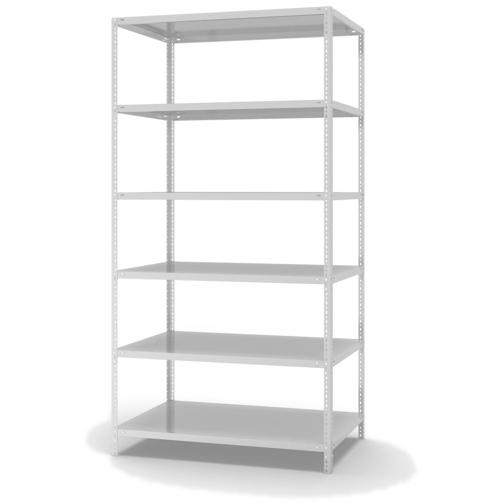 Lagerregal Grundregal Schraubsystem Höhe: 2500 mm Breite: 1000 mm Tiefe: 800 mm Oberflächen Ebenen: RAL 7035 lichtgrau Oberflächen Stützen: RAL 7035 lichtgrau Anzahl der Fachebenen: 6 Stück Fachlast: 150 kg :: Feldlast: 625 kg Bedienung: Zweiseitig