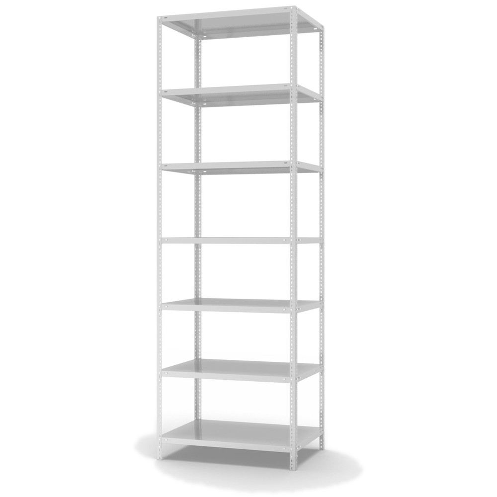 Lagerregal Anbauregal Schraubsystem Höhe: 3000 mm Breite: 1000 mm Tiefe: 600 mm Oberflächen Ebenen: RAL 7035 lichtgrau Oberflächen Stützen: RAL 7035 lichtgrau Anzahl der Fachebenen: 7 Stück Fachlast: 150 kg :: Feldlast: 625 kg Bedienung: Zweiseitig