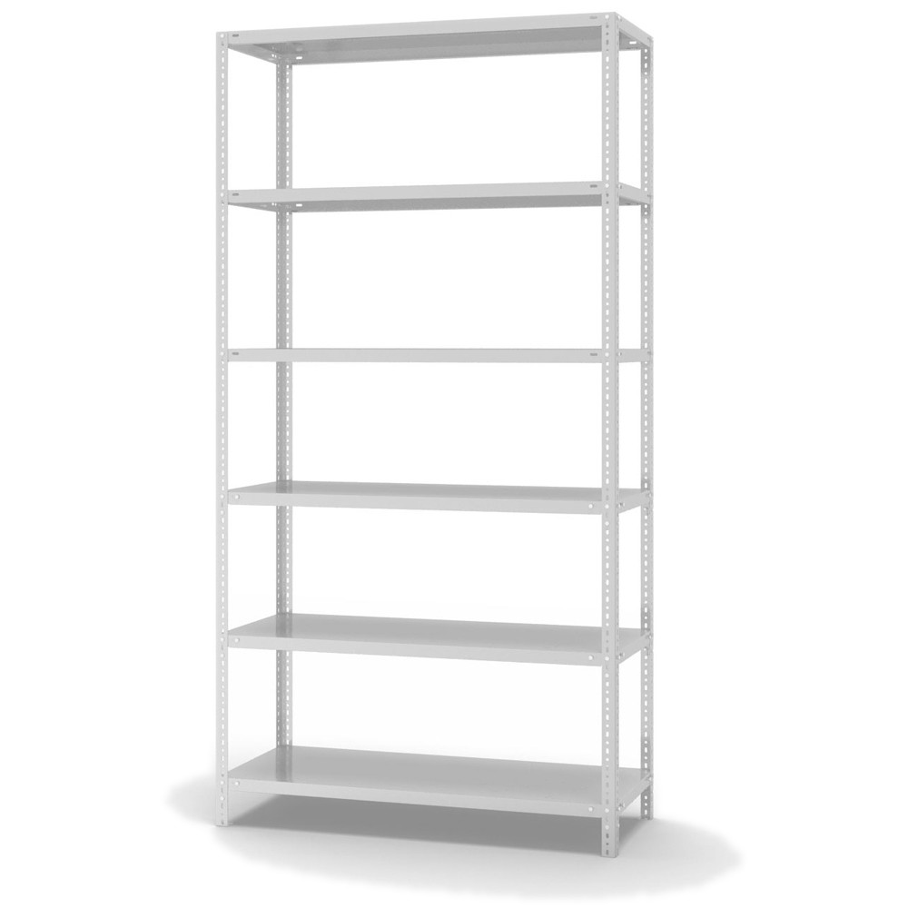 Lagerregal Grundregal Schraubsystem Höhe: 2500 mm Breite: 1000 mm Tiefe: 500 mm Oberflächen Ebenen: RAL 7035 lichtgrau Oberflächen Stützen: RAL 7035 lichtgrau Anzahl der Fachebenen: 6 Stück Fachlast: 225 kg :: Feldlast: 1350 kg Bedienung: Zweiseitig