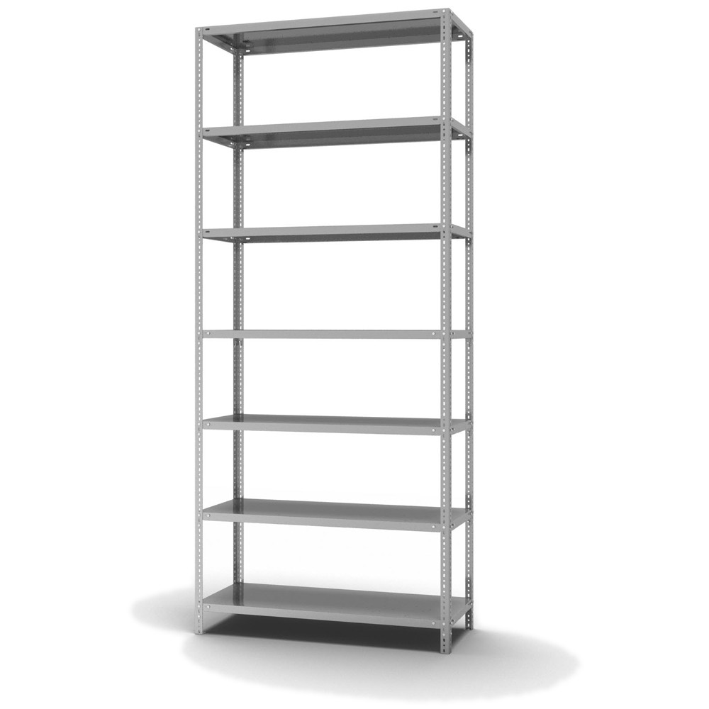 Lagerregal Grundregal Schraubsystem Höhe: 3000 mm Breite: 1000 mm Tiefe: 500 mm Oberflächen Ebenen: verzinkt Oberflächen Stützen: verzinkt Anzahl der Fachebenen: 7 Stück Fachlast: 225 kg :: Feldlast: 1575 kg Bedienung: Zweiseitig