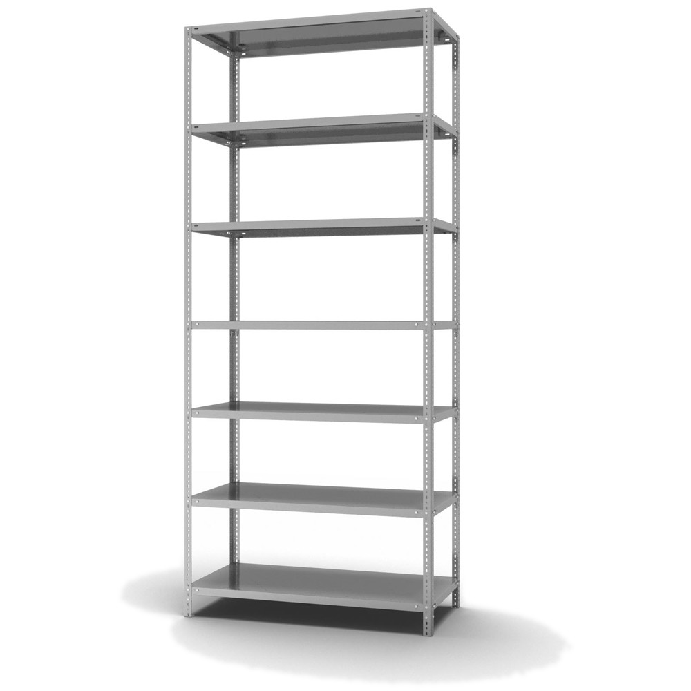 Lagerregal Grundregal Schraubsystem Höhe: 3000 mm Breite: 1000 mm Tiefe: 600 mm Oberflächen Ebenen: verzinkt Oberflächen Stützen: verzinkt Anzahl der Fachebenen: 7 Stück Fachlast: 225 kg :: Feldlast: 1575 kg Bedienung: Zweiseitig