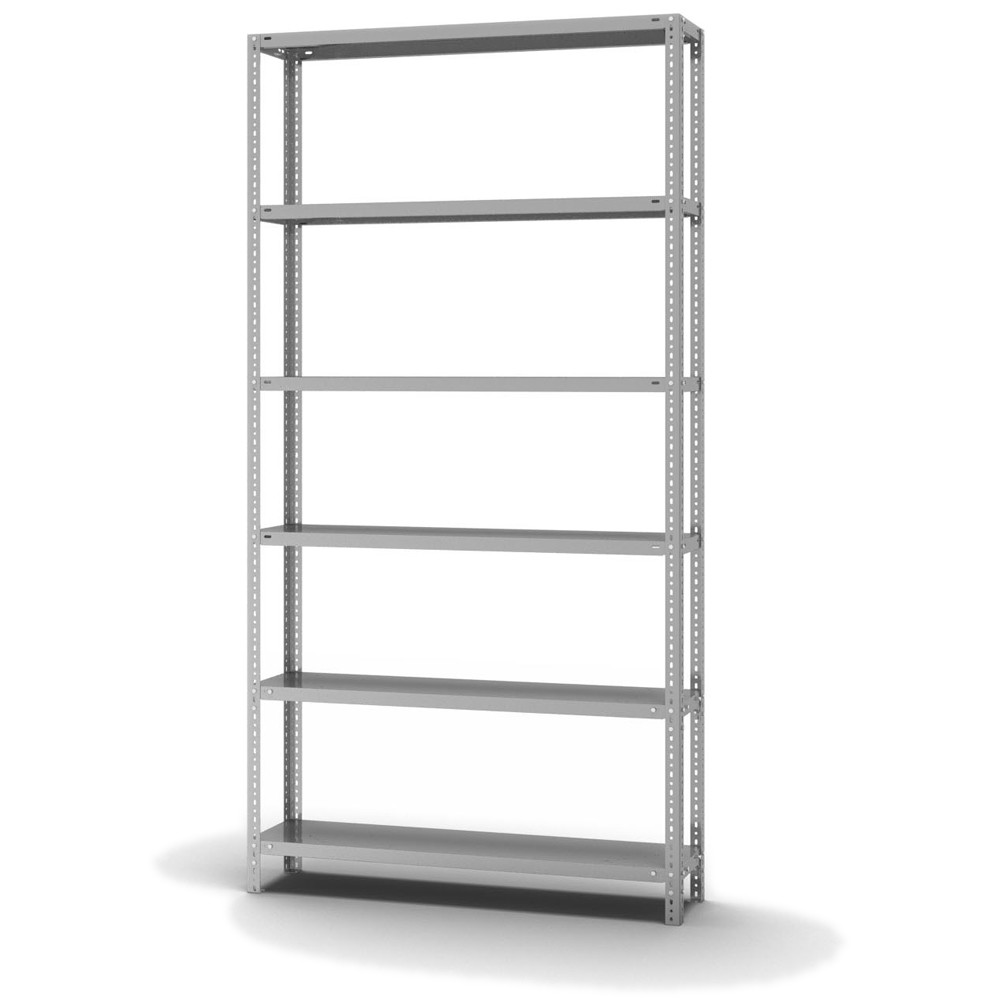 Fachbodenregal Grundregal Schraubsystem Höhe: 2500 mm, Breite: 1000 mm, Tiefe: 300 mm Oberflächen Ebenen: verzinkt / Oberflächen Stützen: verzinkt Anzahl der Fachebenen: 6 Stück Fachlast: 350 kg :: Feldlast: 2100 kg Bedienung: Zweiseitig