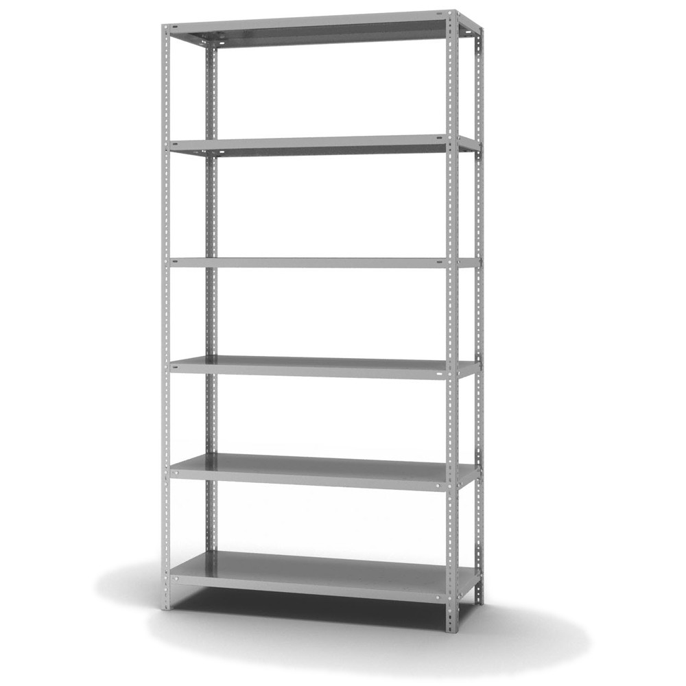 Fachbodenregal Grundregal Schraubsystem Höhe: 2500 mm, Breite: 1000 mm, Tiefe: 500 mm Oberflächen Ebenen: verzinkt / Oberflächen Stützen: verzinkt Anzahl der Fachebenen: 6 Stück Fachlast: 350 kg :: Feldlast: 2100 kg Bedienung: Zweiseitig