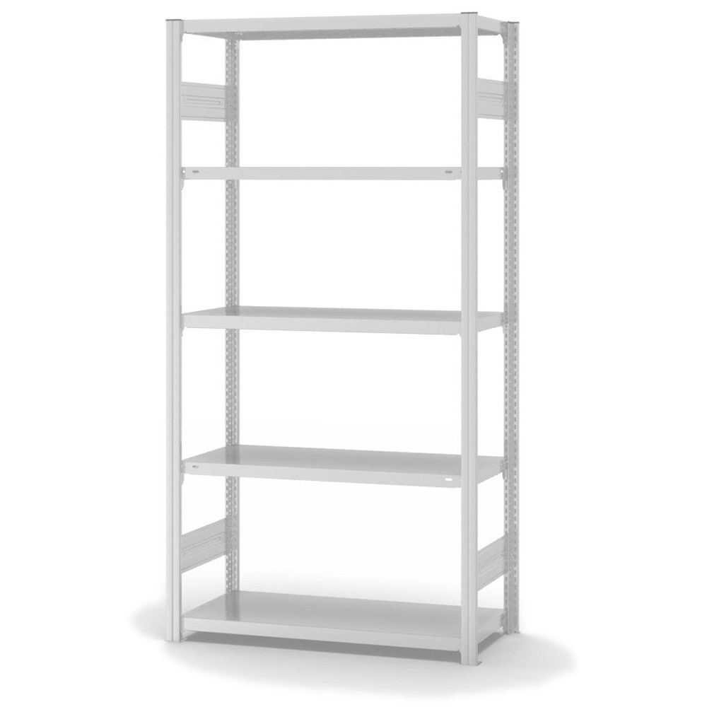Lagerregal Grundregal Stecksystem Höhe: 2000 mm Breite: 750 (810) mm Tiefe: 400 (435) mm Oberflächen Ebenen: RAL 7035 lichtgrau Oberflächen Stützen: RAL 7035 lichtgrau Anzahl der Fachebenen: 5 Stück Fachlast: 225 kg :: Feldlast: 1600 kg Bedienung: Zweiseitig