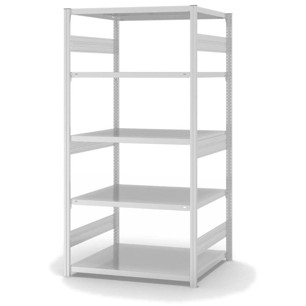Lagerregal Anbauregal Stecksystem Höhe: 2000 mm Breite: 1000 (1010) mm Tiefe: 800 (835) mm Oberflächen Ebenen: RAL 7035 lichtgrau Oberflächen Stützen: RAL 7035 lichtgrau Anzahl der Fachebenen: 5 Stück Fachlast: 300 kg :: Feldlast: 1600 kg Bedienung: Zweiseitig