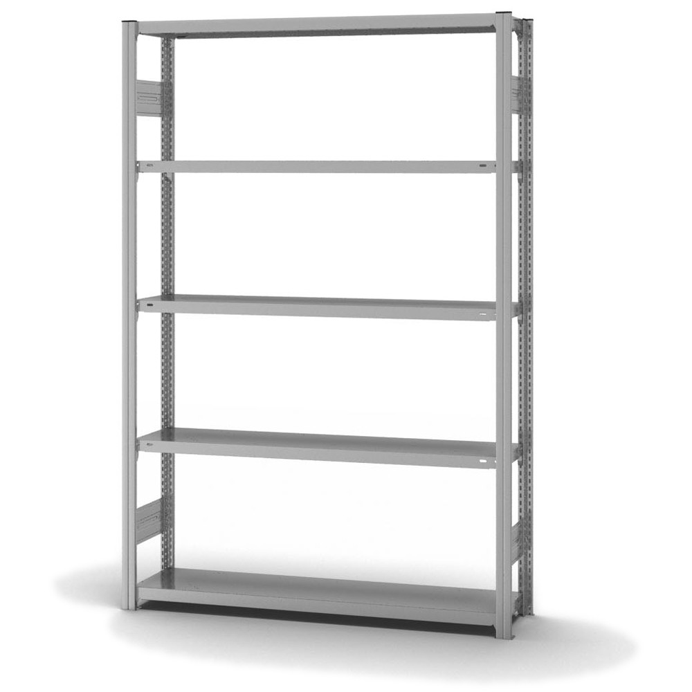 Lagerregal Grundregal Stecksystem Höhe: 2000 mm Breite: 750 (810) mm Tiefe: 300 (335) mm Oberflächen Ebenen: verzinkt Oberflächen Stützen: verzinkt Anzahl der Fachebenen: 5 Stück Fachlast: 150 kg :: Feldlast: 1600 kg Bedienung: Zweiseitig