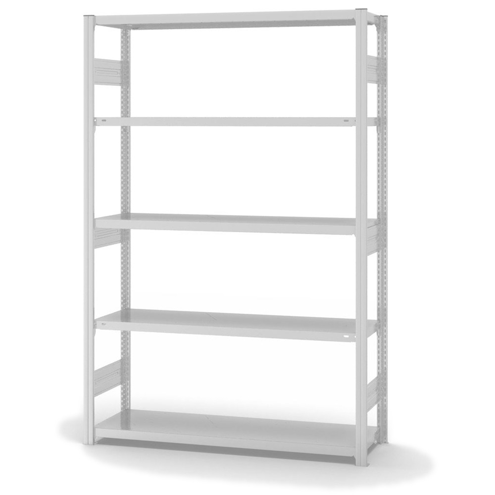 Lagerregal Grundregal Stecksystem Höhe: 2000 mm Breite: 750 (810) mm Tiefe: 400 (435) mm Oberflächen Ebenen: RAL 7035 lichtgrau Oberflächen Stützen: RAL 7035 lichtgrau Anzahl der Fachebenen: 5 Stück Fachlast: 300 kg :: Feldlast: 1600 kg Bedienung: Zweiseitig