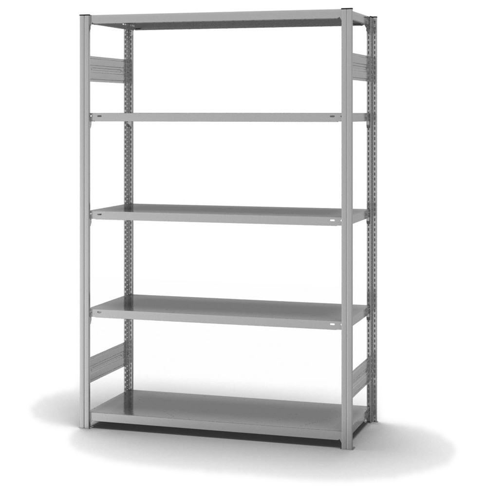 Lagerregal Grundregal Stecksystem Höhe: 2000 mm Breite: 1000 (1060) mm Tiefe: 500 (535) mm Oberflächen Ebenen: verzinkt Oberflächen Stützen: verzinkt Anzahl der Fachebenen: 5 Stück Fachlast: 225 kg :: Feldlast: 1600 kg Bedienung: Zweiseitig