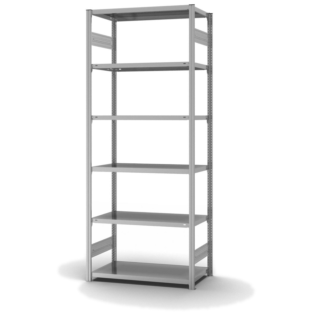 Lagerregal Grundregal Stecksystem Höhe: 2500 mm Breite: 750 (810) mm Tiefe: 500 (535) mm Oberflächen Ebenen: verzinkt Oberflächen Stützen: verzinkt Anzahl der Fachebenen: 6 Stück Fachlast: 150 kg :: Feldlast: 1600 kg Bedienung: Zweiseitig