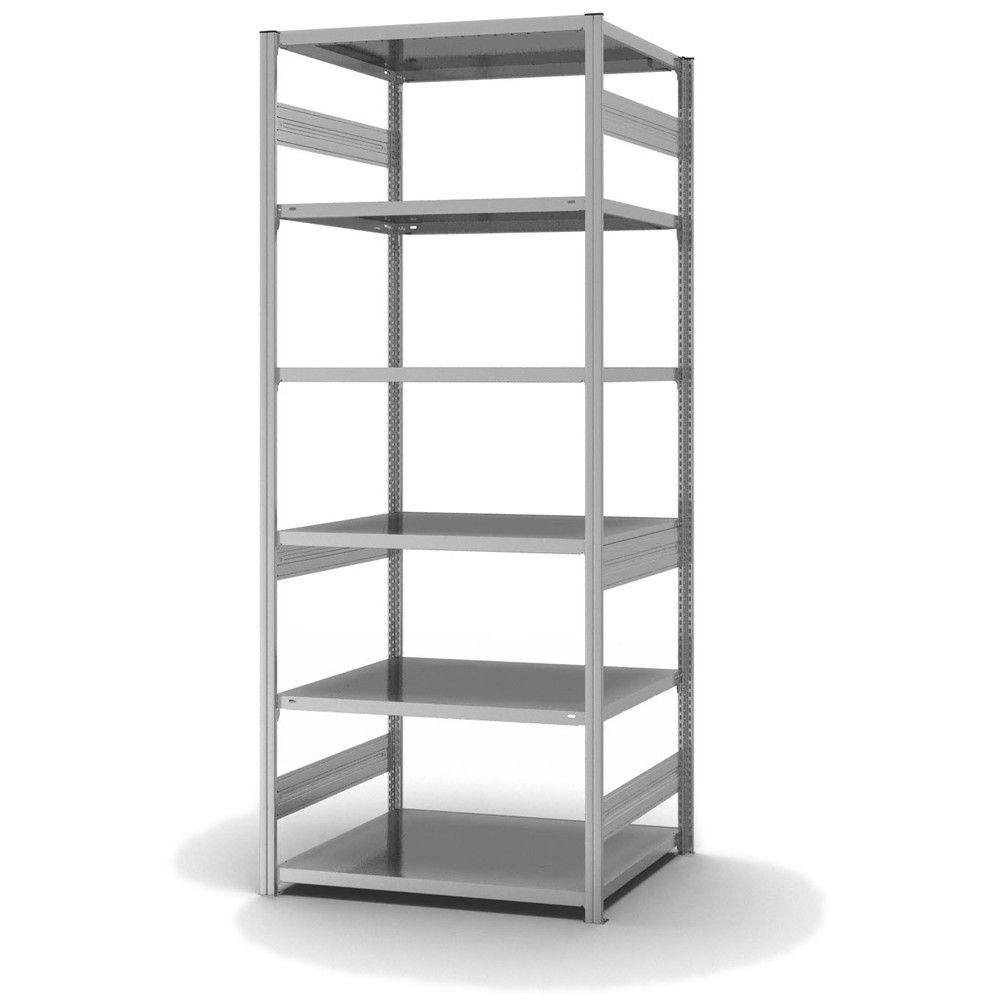 Lagerregal Grundregal Stecksystem Höhe: 2500 mm Breite: 750 (810) mm Tiefe: 800 (835) mm Oberflächen Ebenen: verzinkt Oberflächen Stützen: verzinkt Anzahl der Fachebenen: 6 Stück Fachlast: 300 kg :: Feldlast: 1600 kg Bedienung: Zweiseitig