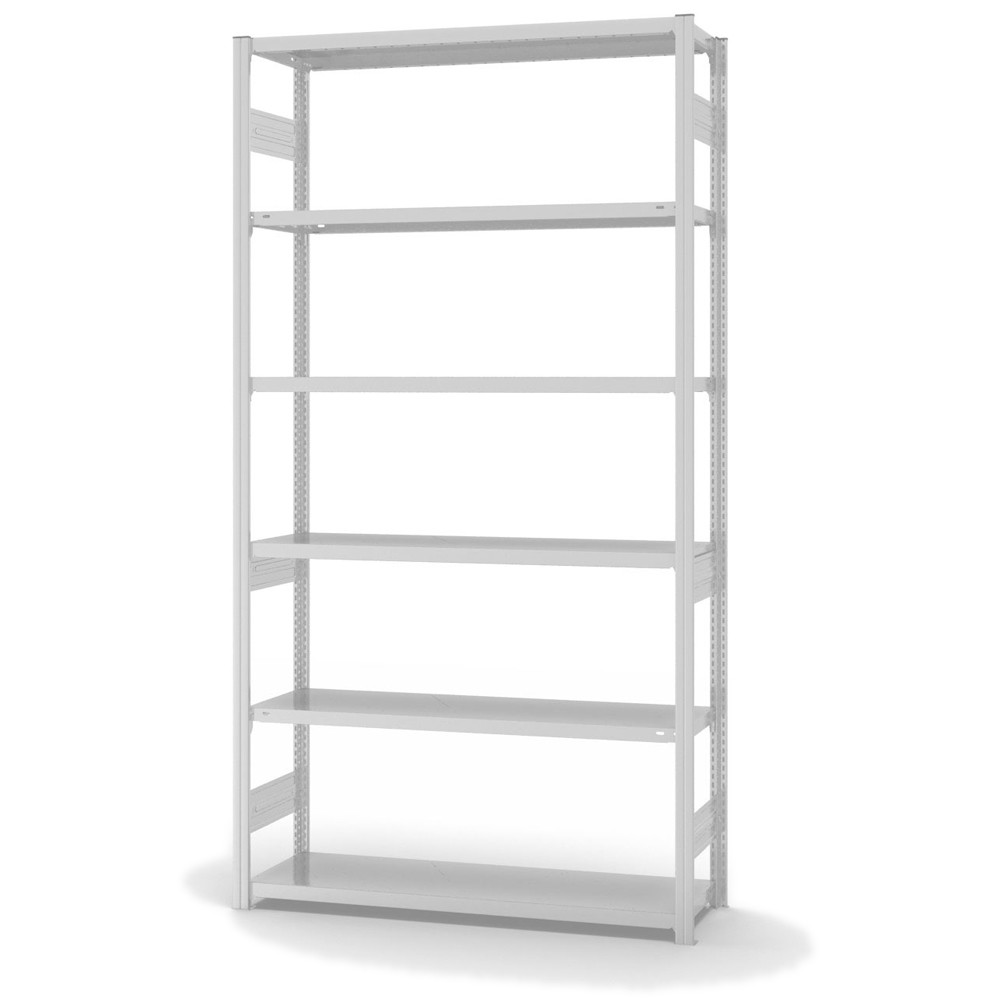 Lagerregal Grundregal Stecksystem Höhe: 2500 mm Breite: 1000 (1060) mm Tiefe: 400 (435) mm Oberflächen Ebenen: RAL 7035 lichtgrau Oberflächen Stützen: RAL 7035 lichtgrau Anzahl der Fachebenen: 6 Stück Fachlast: 300 kg :: Feldlast: 1600 kg Bedienung: Zweiseitig