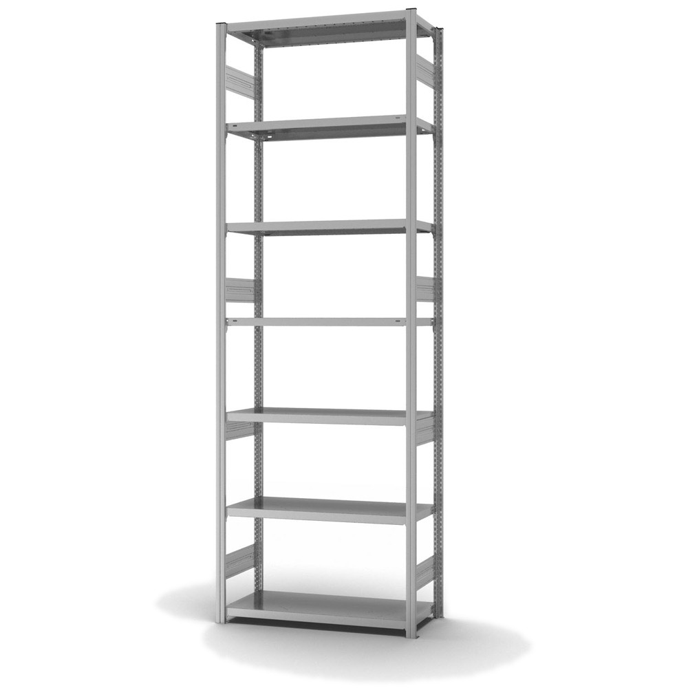 Lagerregal Grundregal Stecksystem Höhe: 3000 mm Breite: 750 (810) mm Tiefe: 400 (435) mm Oberflächen Ebenen: verzinkt Oberflächen Stützen: verzinkt Anzahl der Fachebenen: 7 Stück Fachlast: 300 kg :: Feldlast: 1600 kg Bedienung: Zweiseitig