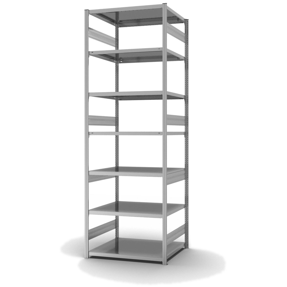 Lagerregal Grundregal Stecksystem Höhe: 3000 mm Breite: 750 (810) mm Tiefe: 800 (835) mm Oberflächen Ebenen: verzinkt Oberflächen Stützen: verzinkt Anzahl der Fachebenen: 7 Stück Fachlast: 300 kg :: Feldlast: 1600 kg Bedienung: Zweiseitig