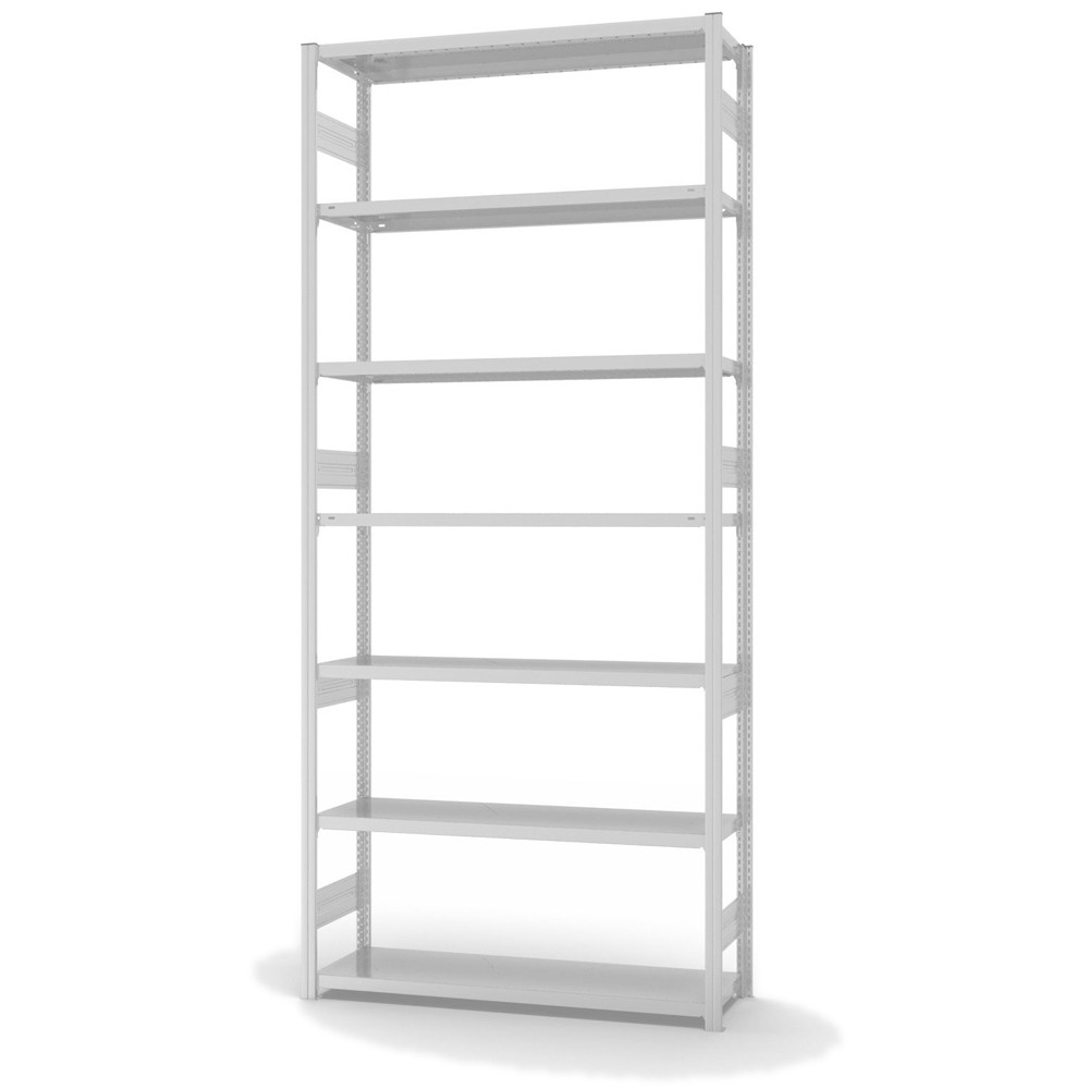Lagerregal Anbauregal Stecksystem Höhe: 3000 mm Breite: 750 (760) mm Tiefe: 400 (435) mm Oberflächen Ebenen: RAL 7035 lichtgrau Oberflächen Stützen: RAL 7035 lichtgrau Anzahl der Fachebenen: 7 Stück Fachlast: 300 kg :: Feldlast: 1600 kg Bedienung: Zweiseitig
