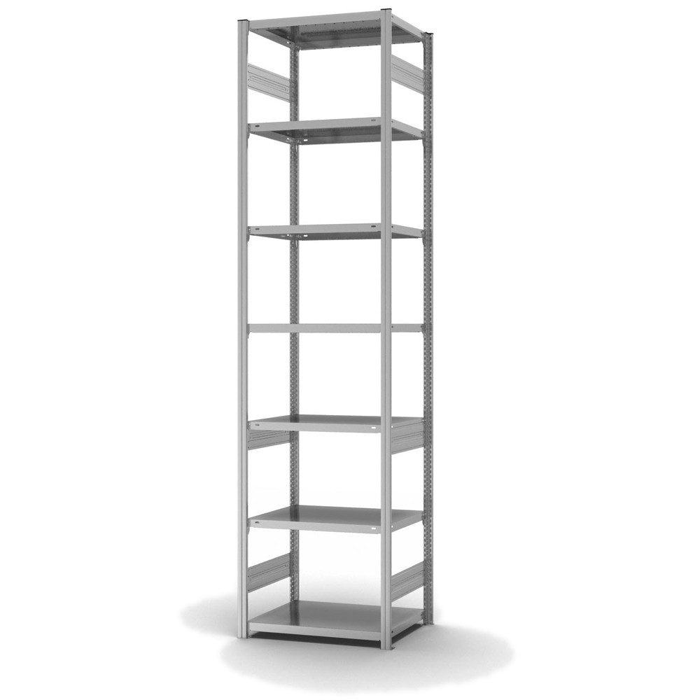 Lagerregal Anbauregal Stecksystem Höhe: 3000 mm Breite: 750 (760) mm Tiefe: 500 (535) mm Oberflächen Ebenen: verzinkt Oberflächen Stützen: verzinkt Anzahl der Fachebenen: 7 Stück Fachlast: 150 kg :: Feldlast: 1600 kg Bedienung: Zweiseitig