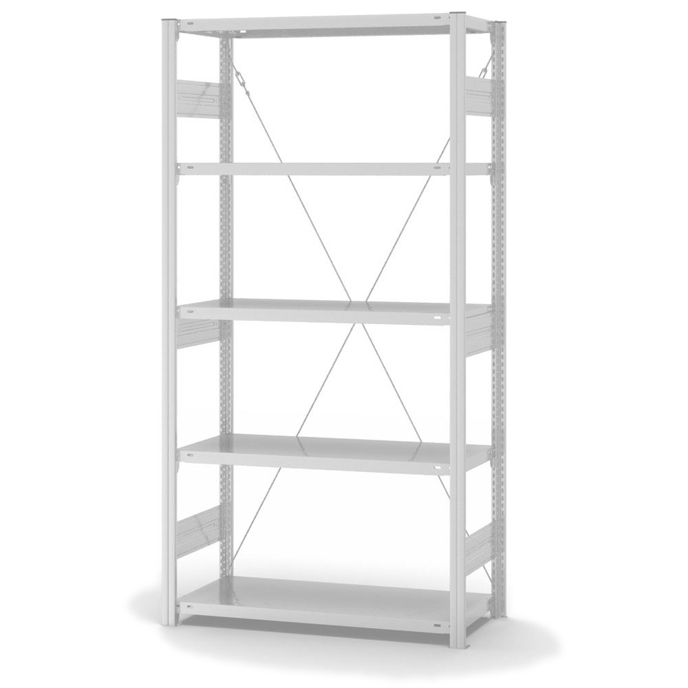 Lagerregal Grundregal Stecksystem Höhe: 2000 mm Breite: 750 (810) mm Tiefe: 400 (435) mm Oberflächen Ebenen: RAL 7035 lichtgrau Oberflächen Stützen: RAL 7035 lichtgrau Anzahl der Fachebenen: 5 Stück Fachlast: 300 kg :: Feldlast: 1600 kg Bedienung: Einseitig