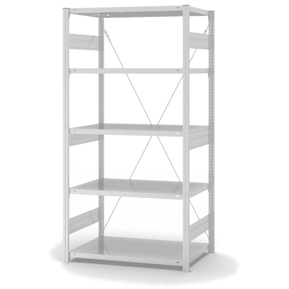 Lagerregal Grundregal Stecksystem Höhe: 2000 mm Breite: 750 (810) mm Tiefe: 600 (635) mm Oberflächen Ebenen: RAL 7035 lichtgrau Oberflächen Stützen: RAL 7035 lichtgrau Anzahl der Fachebenen: 5 Stück Fachlast: 300 kg :: Feldlast: 1600 kg Bedienung: Einseitig