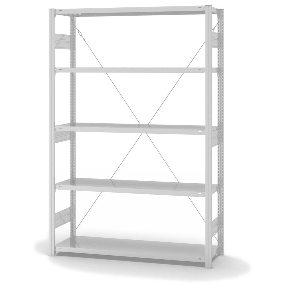Lagerregal Grundregal Stecksystem Höhe: 2000 mm Breite: 1000 (1060) mm Tiefe: 400 (435) mm Oberflächen Ebenen: RAL 7035 lichtgrau Oberflächen Stützen: RAL 7035 lichtgrau Anzahl der Fachebenen: 5 Stück Fachlast: 300 kg :: Feldlast: 1600 kg Bedienung: Einseitig