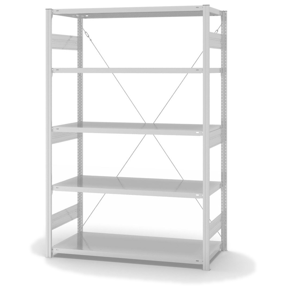 Lagerregal Anbauregal Stecksystem Höhe: 2000 mm Breite: 750 (760) mm Tiefe: 600 (635) mm Oberflächen Ebenen: RAL 7035 lichtgrau Oberflächen Stützen: RAL 7035 lichtgrau Anzahl der Fachebenen: 5 Stück Fachlast: 300 kg :: Feldlast: 1600 kg Bedienung: Einseitig