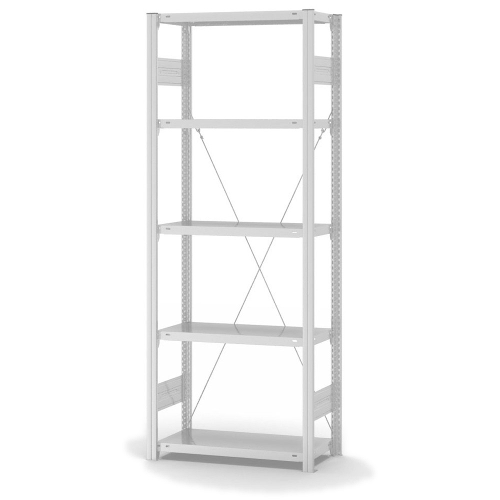 Lagerregal Grundregal Stecksystem Höhe: 2000 mm Breite: 1000 (1060) mm Tiefe: 300 (335) mm Oberflächen Ebenen: RAL 7035 lichtgrau Oberflächen Stützen: RAL 7035 lichtgrau Anzahl der Fachebenen: 5 Stück Fachlast: 150 kg :: Feldlast: 1600 kg Bedienung: Einseitig
