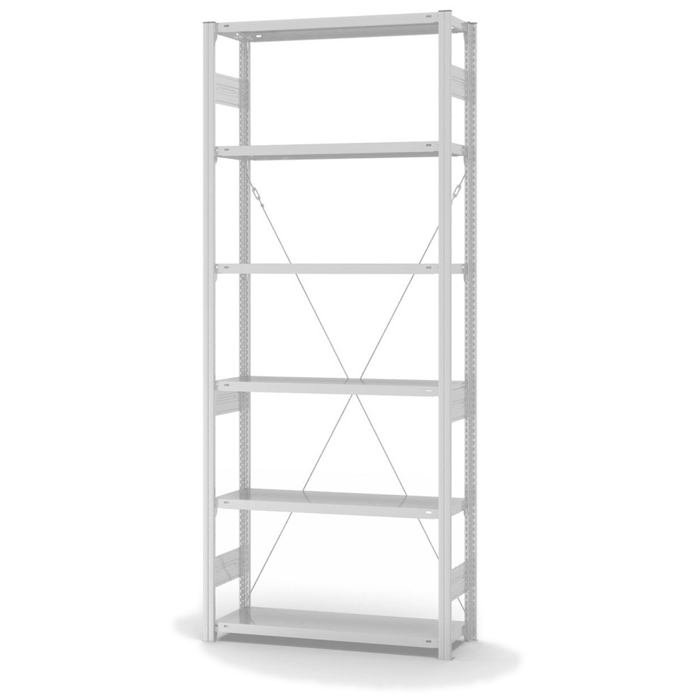 Lagerregal Anbauregal Stecksystem Höhe: 2500 mm Breite: 1000 (1010) mm Tiefe: 300 (335) mm Oberflächen Ebenen: RAL 7035 lichtgrau Oberflächen Stützen: RAL 7035 lichtgrau Anzahl der Fachebenen: 6 Stück Fachlast: 225 kg :: Feldlast: 1600 kg Bedienung: Einseitig