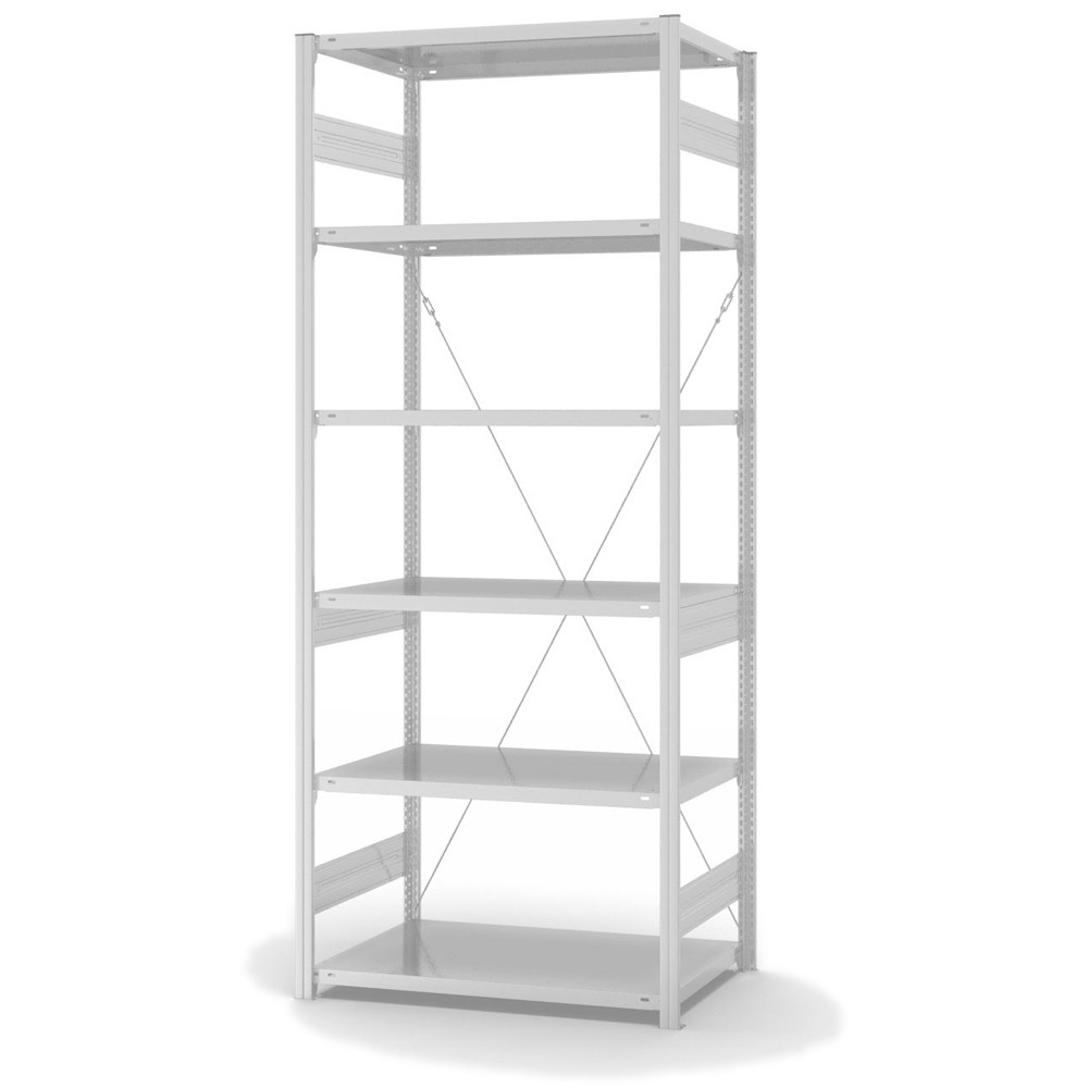 Lagerregal Grundregal Stecksystem Höhe: 2500 mm Breite: 750 (810) mm Tiefe: 600 (635) mm Oberflächen Ebenen: RAL 7035 lichtgrau Oberflächen Stützen: RAL 7035 lichtgrau Anzahl der Fachebenen: 6 Stück Fachlast: 300 kg :: Feldlast: 1600 kg Bedienung: Einseitig
