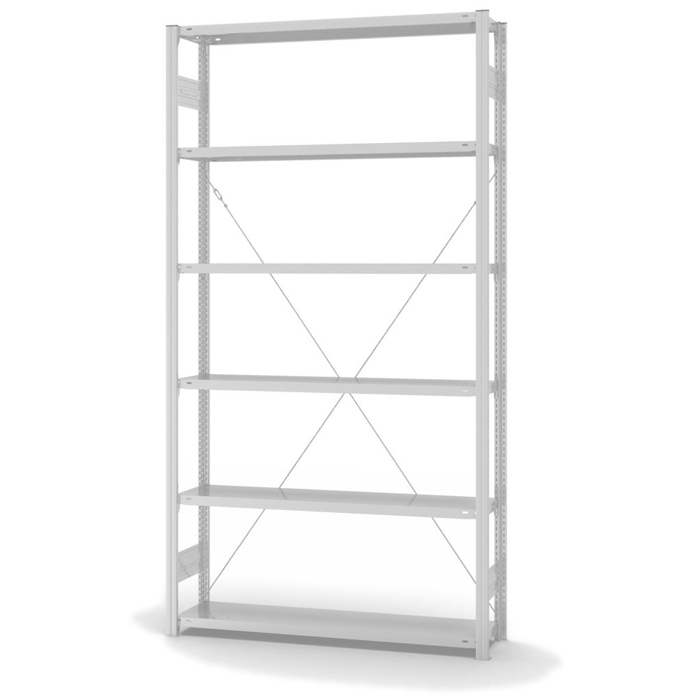 Lagerregal Grundregal Stecksystem Höhe: 2500 mm Breite: 1000 (1060) mm Tiefe: 300 (335) mm Oberflächen Ebenen: RAL 7035 lichtgrau Oberflächen Stützen: RAL 7035 lichtgrau Anzahl der Fachebenen: 6 Stück Fachlast: 150 kg :: Feldlast: 1600 kg Bedienung: Einseitig