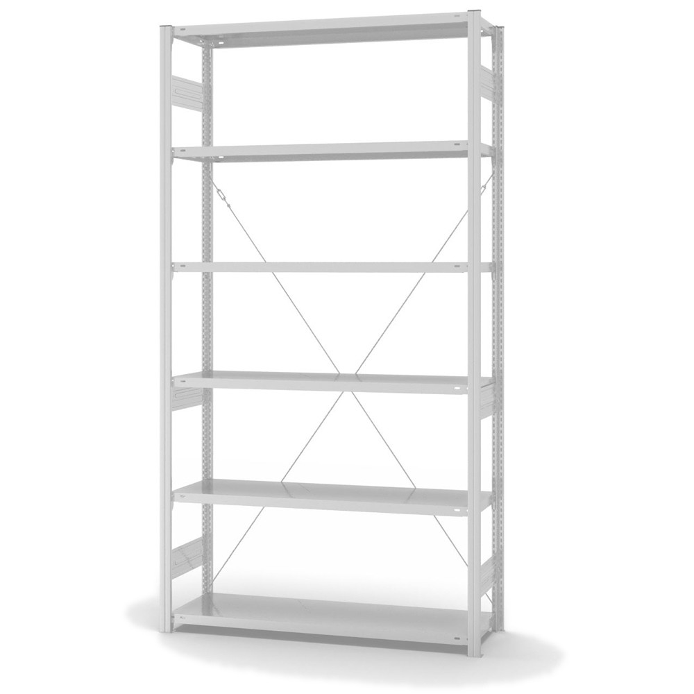 Lagerregal Anbauregal Stecksystem Höhe: 2500 mm Breite: 1000 (1010) mm Tiefe: 400 (435) mm Oberflächen Ebenen: RAL 7035 lichtgrau Oberflächen Stützen: RAL 7035 lichtgrau Anzahl der Fachebenen: 6 Stück Fachlast: 300 kg :: Feldlast: 1600 kg Bedienung: Einseitig