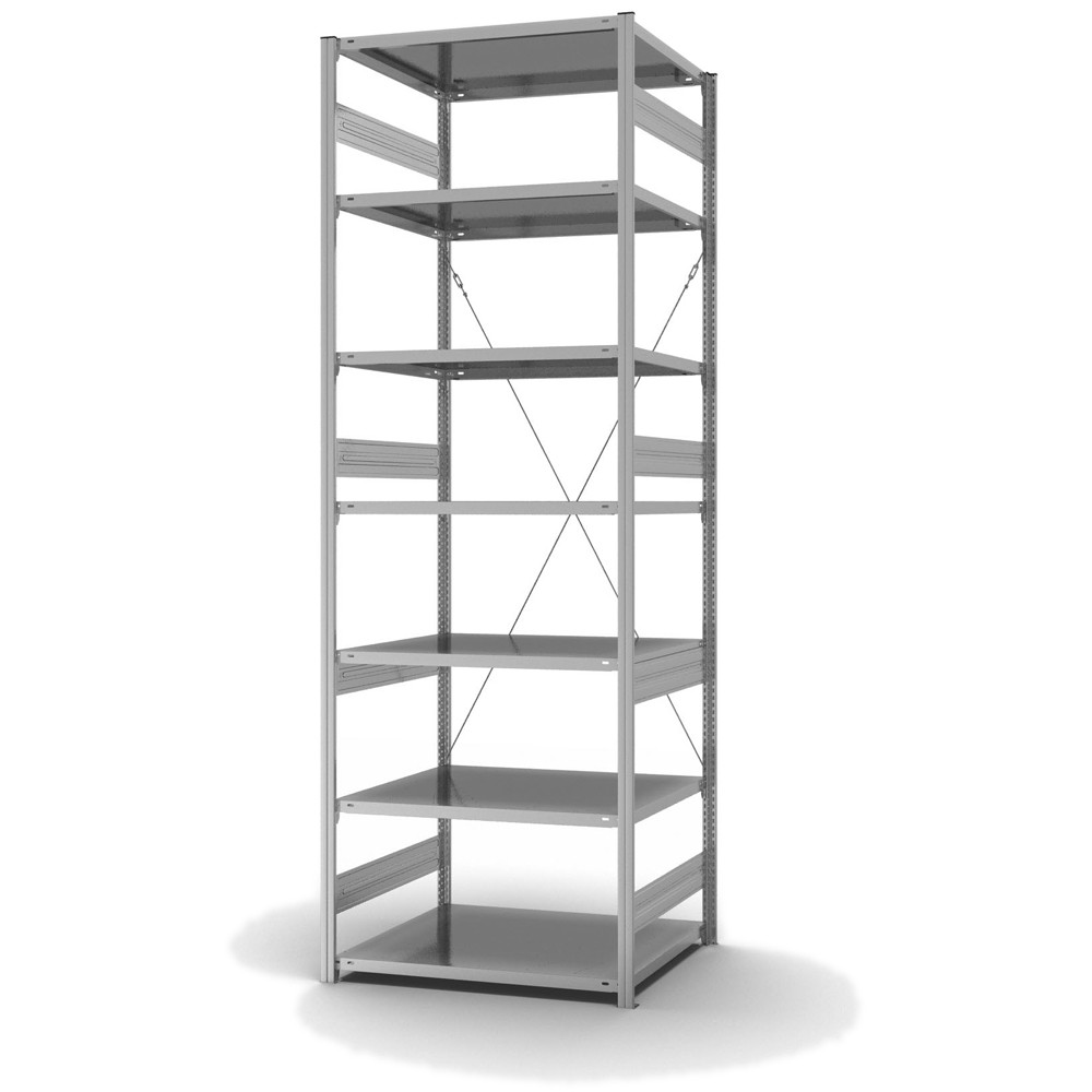 Lagerregal Grundregal Stecksystem Höhe: 3000 mm Breite: 750 (810) mm Tiefe: 800 (835) mm Oberflächen Ebenen: verzinkt Oberflächen Stützen: verzinkt Anzahl der Fachebenen: 7 Stück Fachlast: 300 kg :: Feldlast: 1600 kg Bedienung: Einseitig