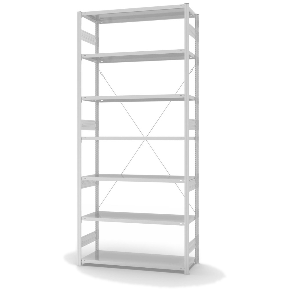 Lagerregal Anbauregal Stecksystem Höhe: 3000 mm Breite: 1000 (1010) mm Tiefe: 500 (535) mm Oberflächen Ebenen: RAL 7035 lichtgrau Oberflächen Stützen: RAL 7035 lichtgrau Anzahl der Fachebenen: 7 Stück Fachlast: 300 kg :: Feldlast: 1600 kg Bedienung: Einseitig