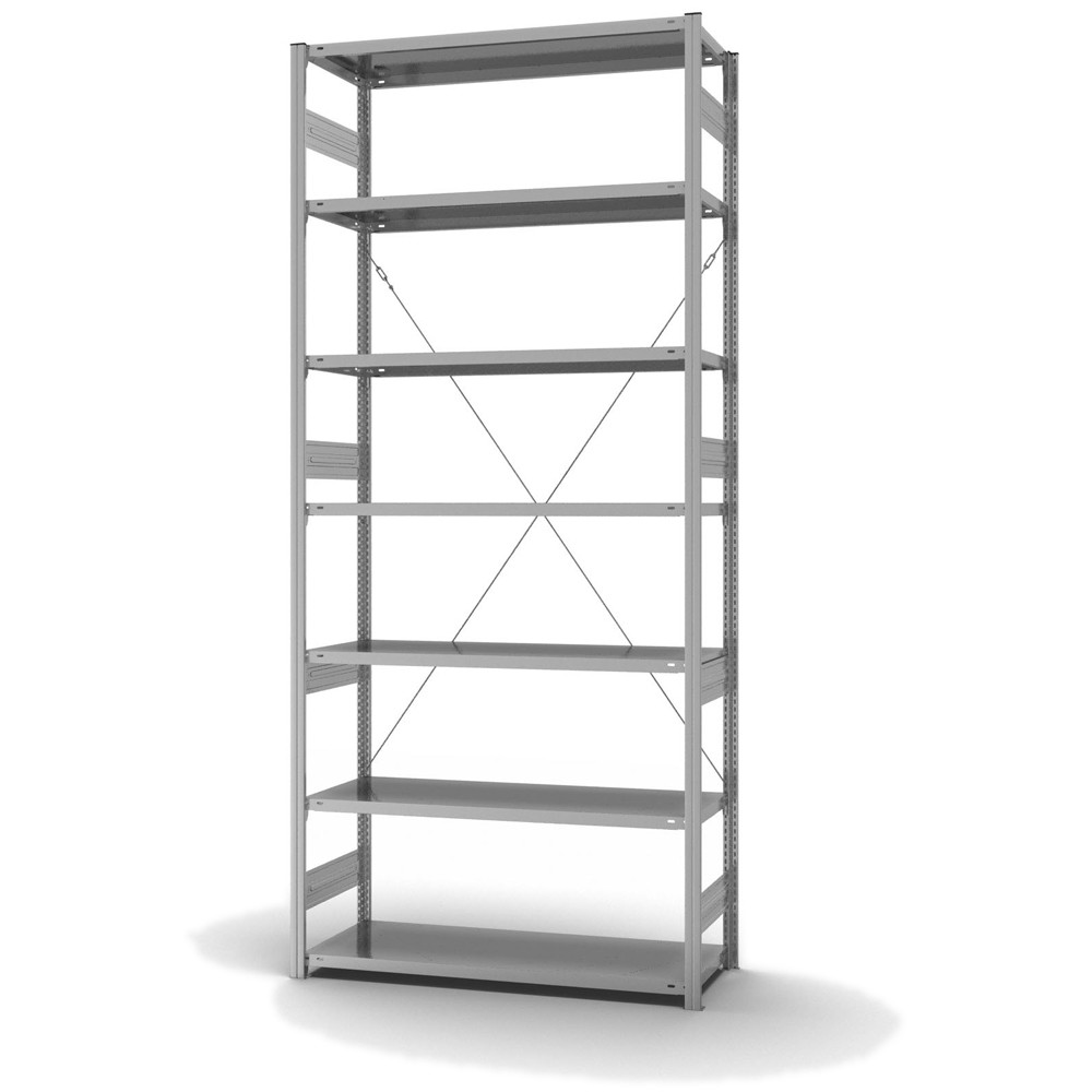 Lagerregal Grundregal Stecksystem Höhe: 3000 mm Breite: 750 (810) mm Tiefe: 500 (535) mm Oberflächen Ebenen: verzinkt Oberflächen Stützen: verzinkt Anzahl der Fachebenen: 7 Stück Fachlast: 300 kg :: Feldlast: 1600 kg Bedienung: Einseitig