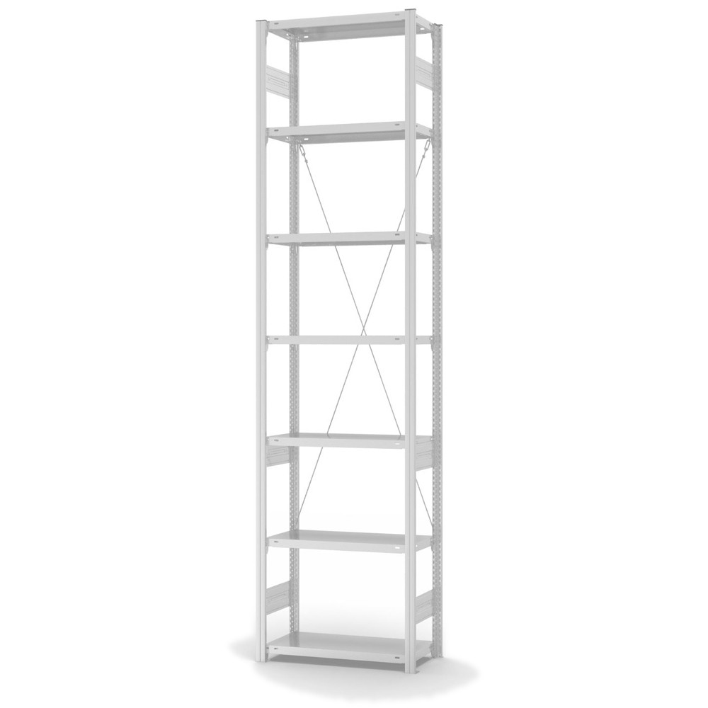 Lagerregal Anbauregal Stecksystem Höhe: 3000 mm Breite: 1000 (1010) mm Tiefe: 300 (335) mm Oberflächen Ebenen: RAL 7035 lichtgrau Oberflächen Stützen: RAL 7035 lichtgrau Anzahl der Fachebenen: 7 Stück Fachlast: 150 kg :: Feldlast: 1600 kg Bedienung: Einseitig