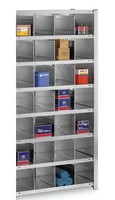 Fächerregal Stecksystem Höhe: 2000 mm, Breite: 1000 mm, Tiefe: 300 mm Oberflächen Ebenen: verzinkt / Oberflächen Stützen: verzinkt Anzahl der Fachebenen: 7 Stück Fachlast: 200 kg :: Feldlast: 1200 kg Bedienung: Einseitig Zusatzinfo: 28 Gefächer