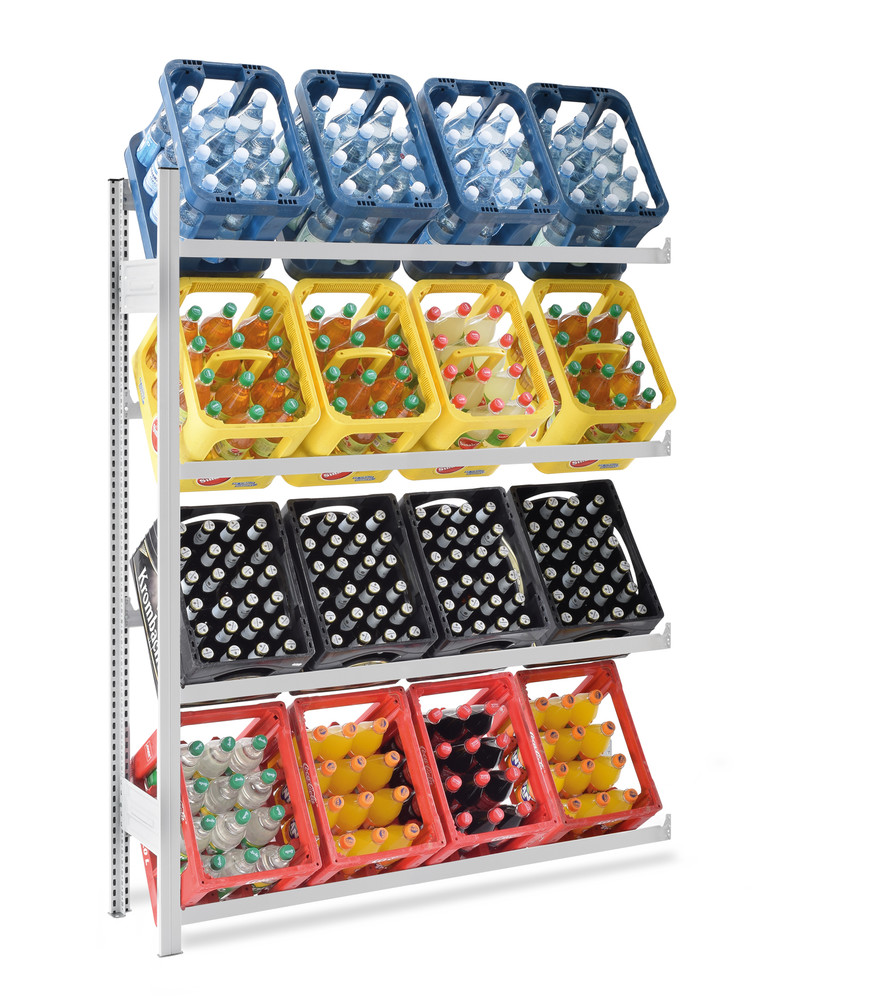 Getränkekistenregal Anbauregal Stecksystem Höhe: 1750 mm, Breite: 750 mm, Tiefe: 300 mm Oberflächen Ebenen: RAL 7035 / Oberflächen Stützen: RAL 7035 Anzahl der Fachebenen: 3 Stück Fachlast: 100 kg :: Feldlast: 300 kg Bedienung: Einseitig Zusatzinfo: Für 6 Getränkekisten