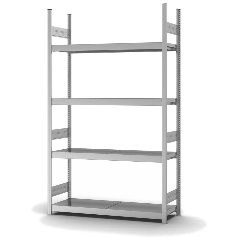 Grossfachregal Anbauregal Stecksystem Höhe: 2500 mm, Breite: 1500 mm, Tiefe: 400 mm Oberflächen Ebenen: verzinkt / Oberflächen Stützen: verzinkt Anzahl der Fachebenen: 4 Stück Fachlast: 350 kg :: Feldlast: 1750 kg Bedienung: Zweiseitig