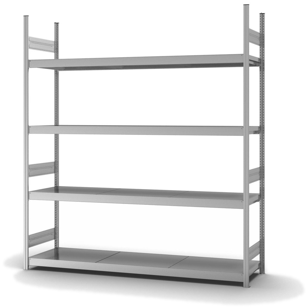 Grossfachregal Anbauregal Stecksystem Höhe: 2500 mm, Breite: 2200 mm, Tiefe: 500 mm Oberflächen Ebenen: verzinkt / Oberflächen Stützen: verzinkt Anzahl der Fachebenen: 4 Stück Fachlast: 350 kg :: Feldlast: 1750 kg Bedienung: Zweiseitig