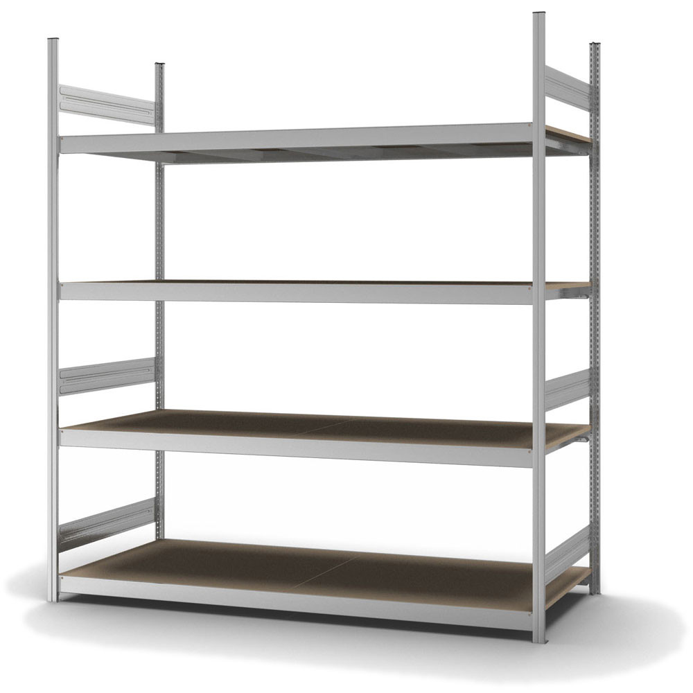 Grossfachregal Anbauregal Stecksystem Höhe: 2500 mm, Breite: 2000 mm, Tiefe: 800 mm Oberflächen Ebenen: Spanplatte / Oberflächen Stützen: verzinkt Anzahl der Fachebenen: 4 Stück Fachlast: 350 kg :: Feldlast: 1750 kg Bedienung: Zweiseitig