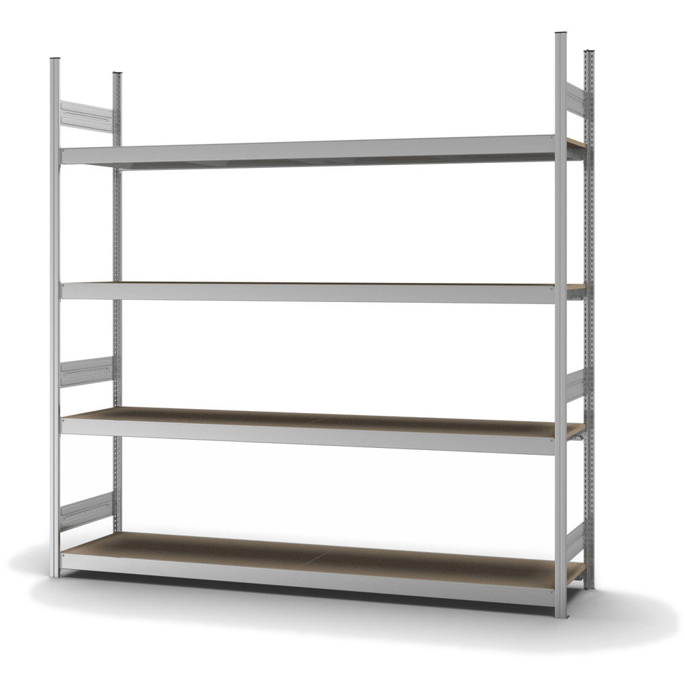 Grossfachregal Anbauregal Stecksystem Höhe: 2500 mm, Breite: 2000 mm, Tiefe: 500 mm Oberflächen Ebenen: Spanplatte / Oberflächen Stützen: verzinkt Anzahl der Fachebenen: 4 Stück Fachlast: 350 kg :: Feldlast: 1750 kg Bedienung: Zweiseitig